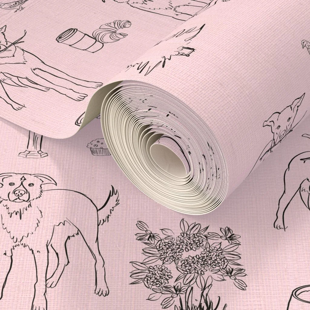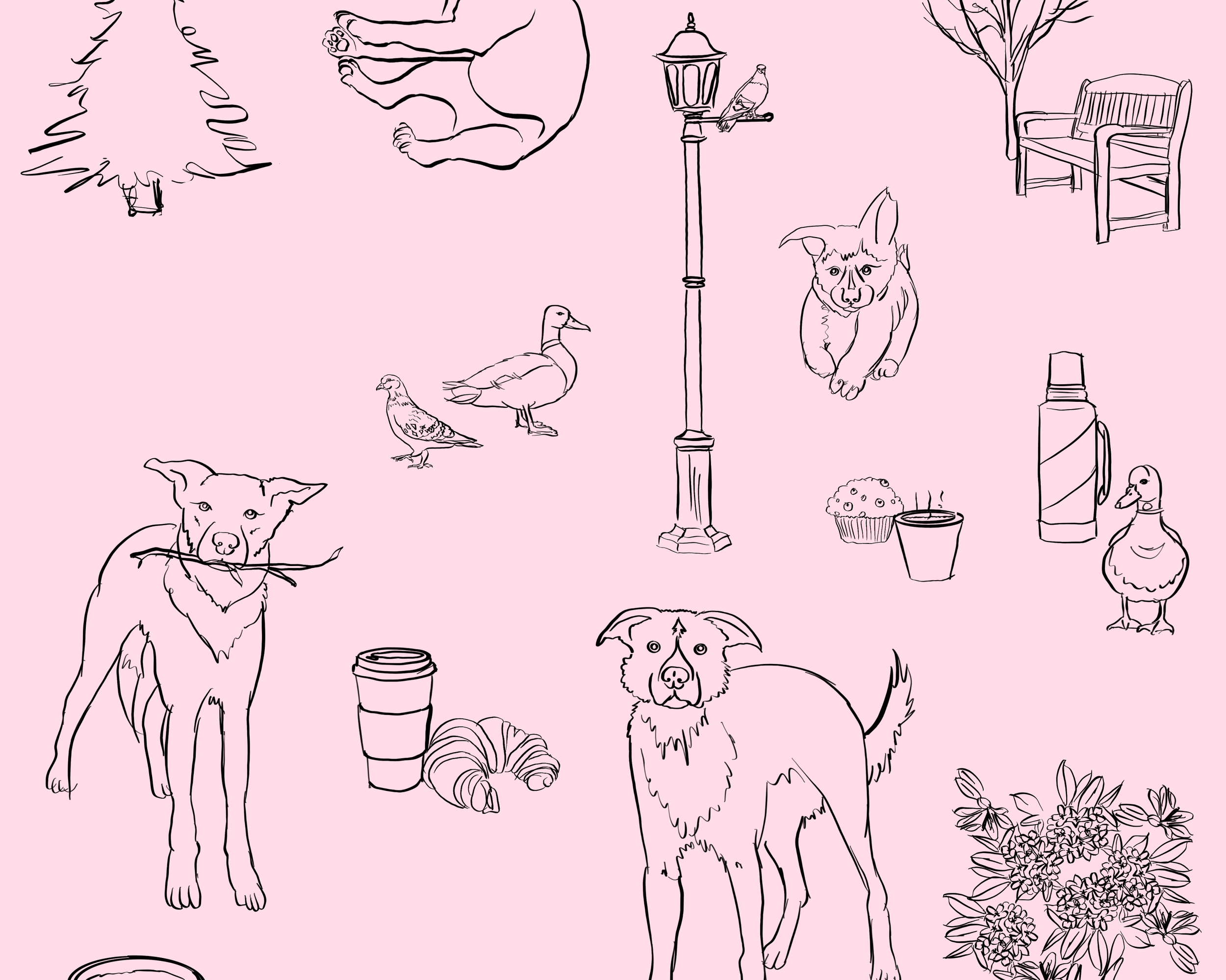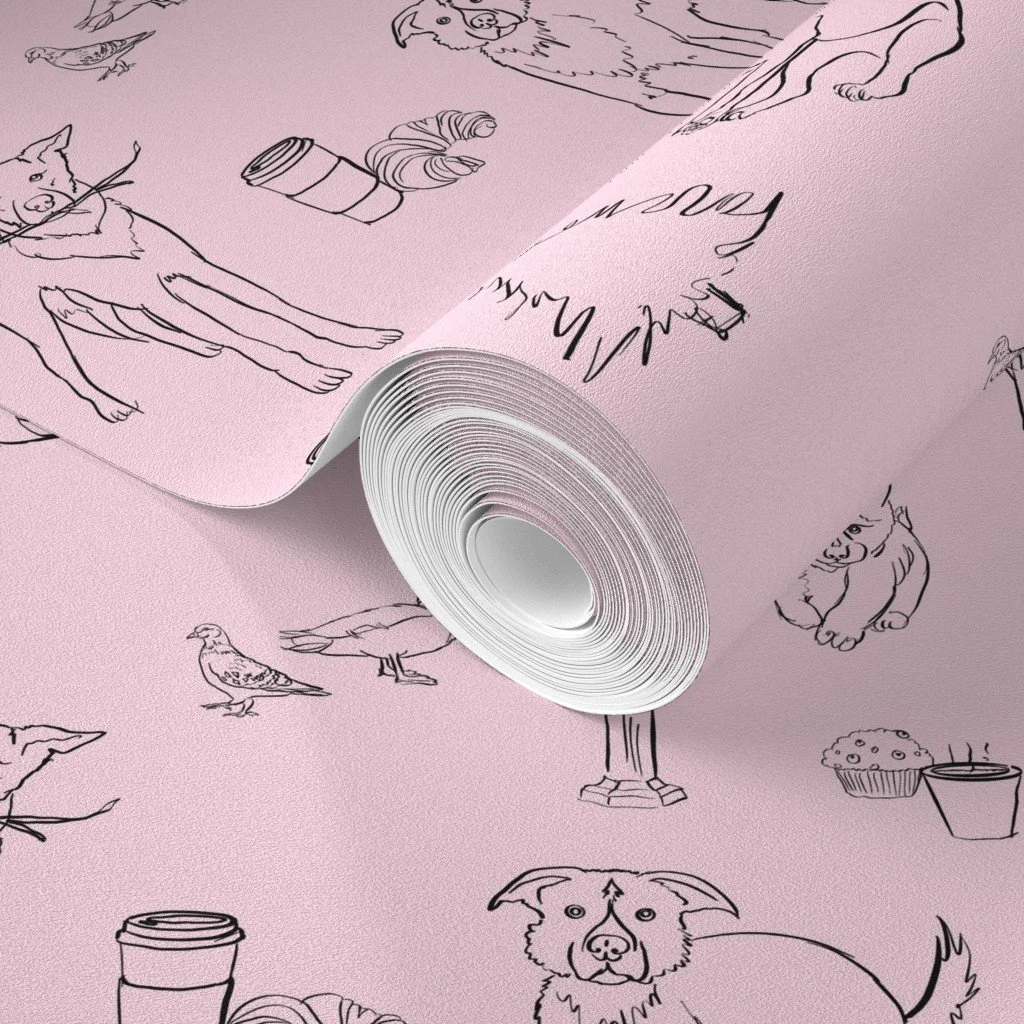Coffee in the Park with Dogs Black Line Art on Soft Pink