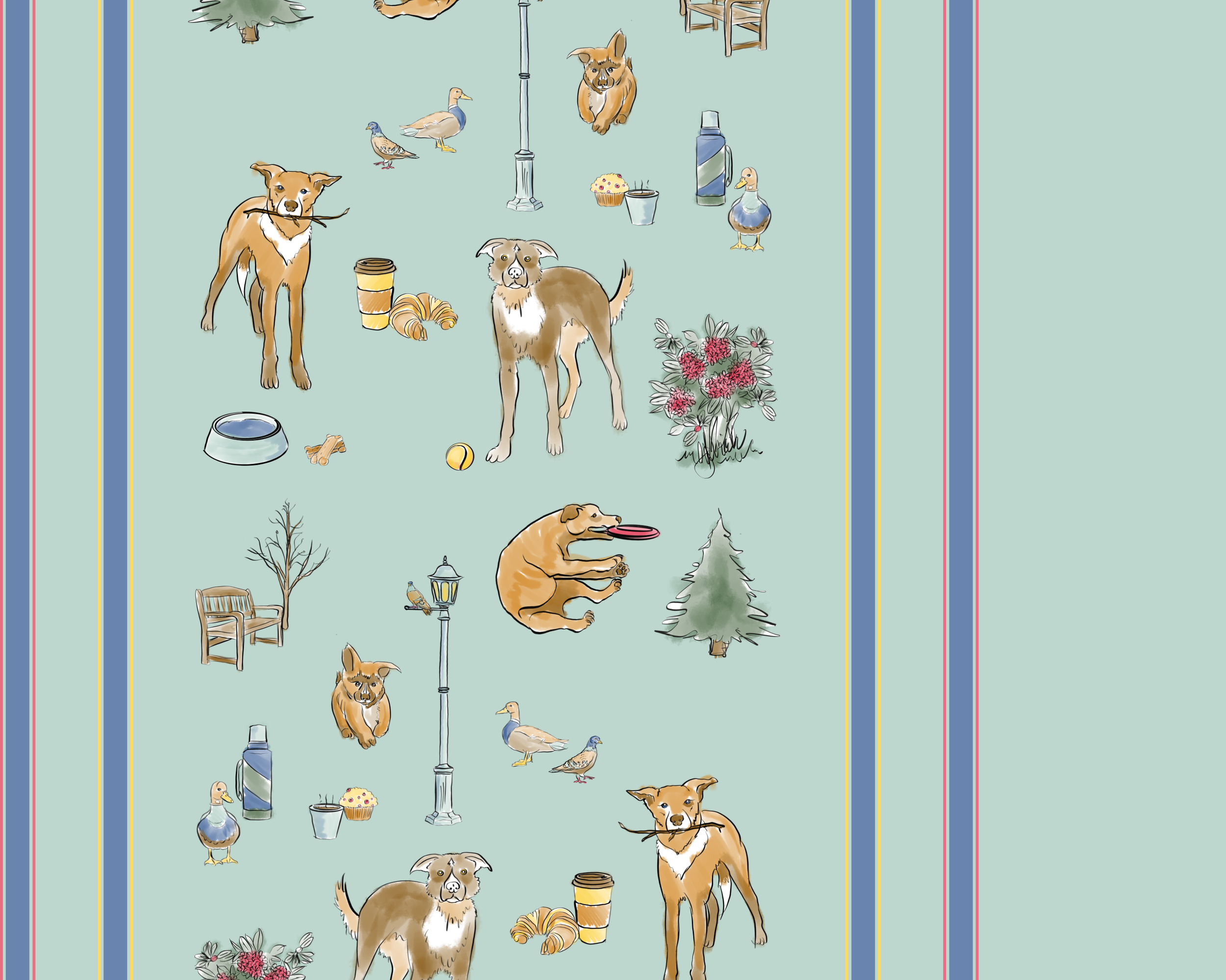 Coffee in the Park with Dogs Full-color Stripes + Multicolor Stripes on Aqua Wallpaper