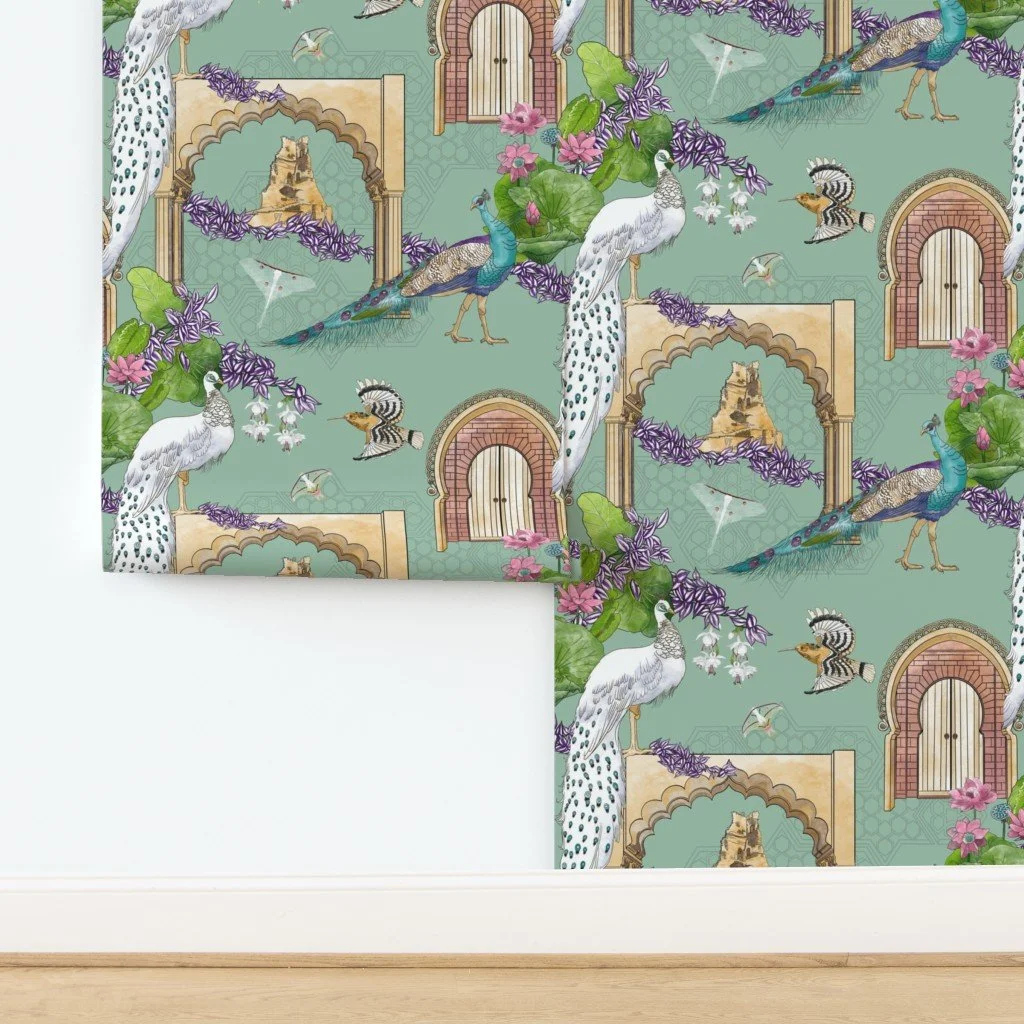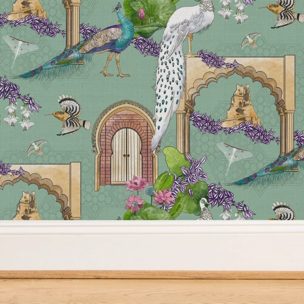 The Beauty of India - Life Among the Arches - Watercolor Toile on Sage Wallpaper